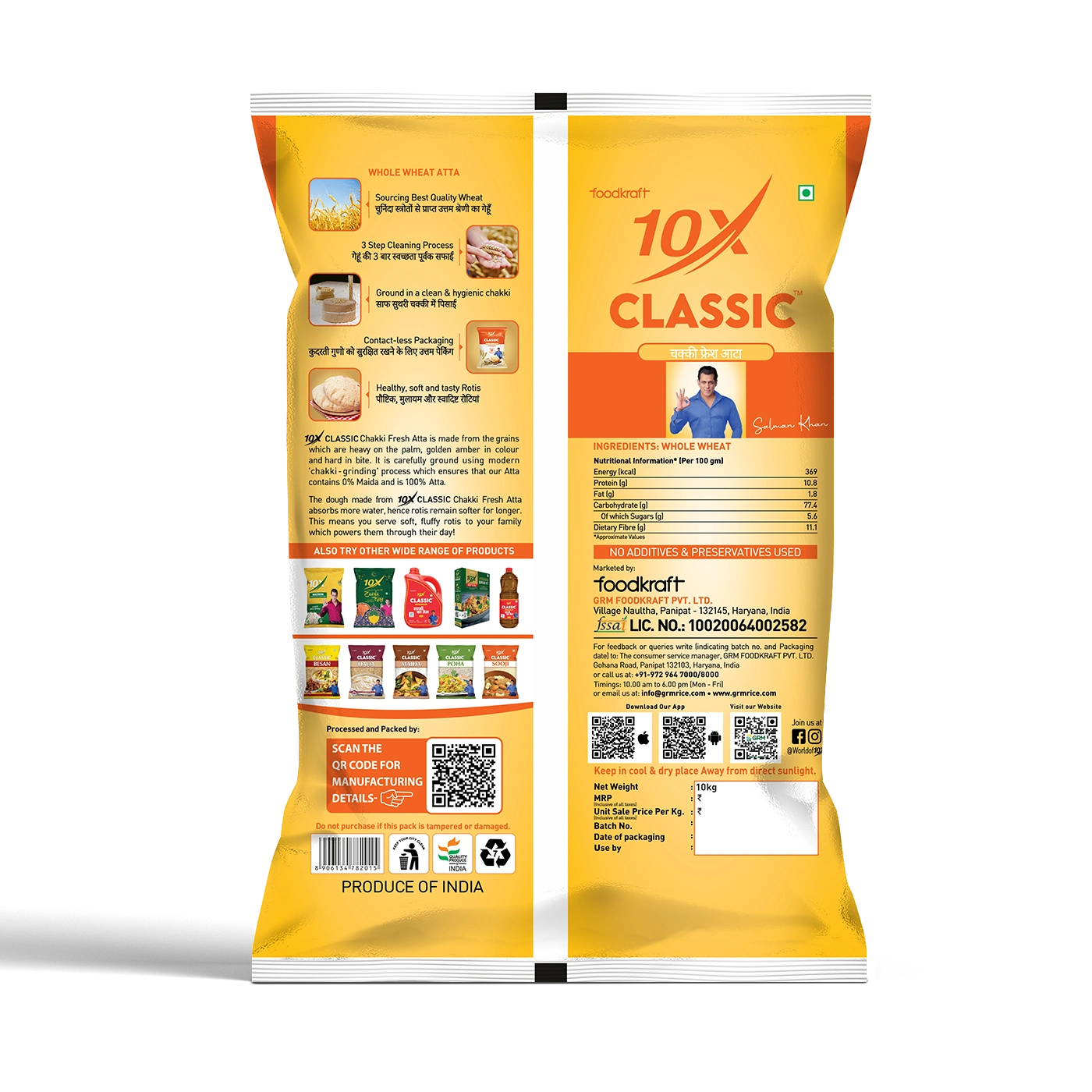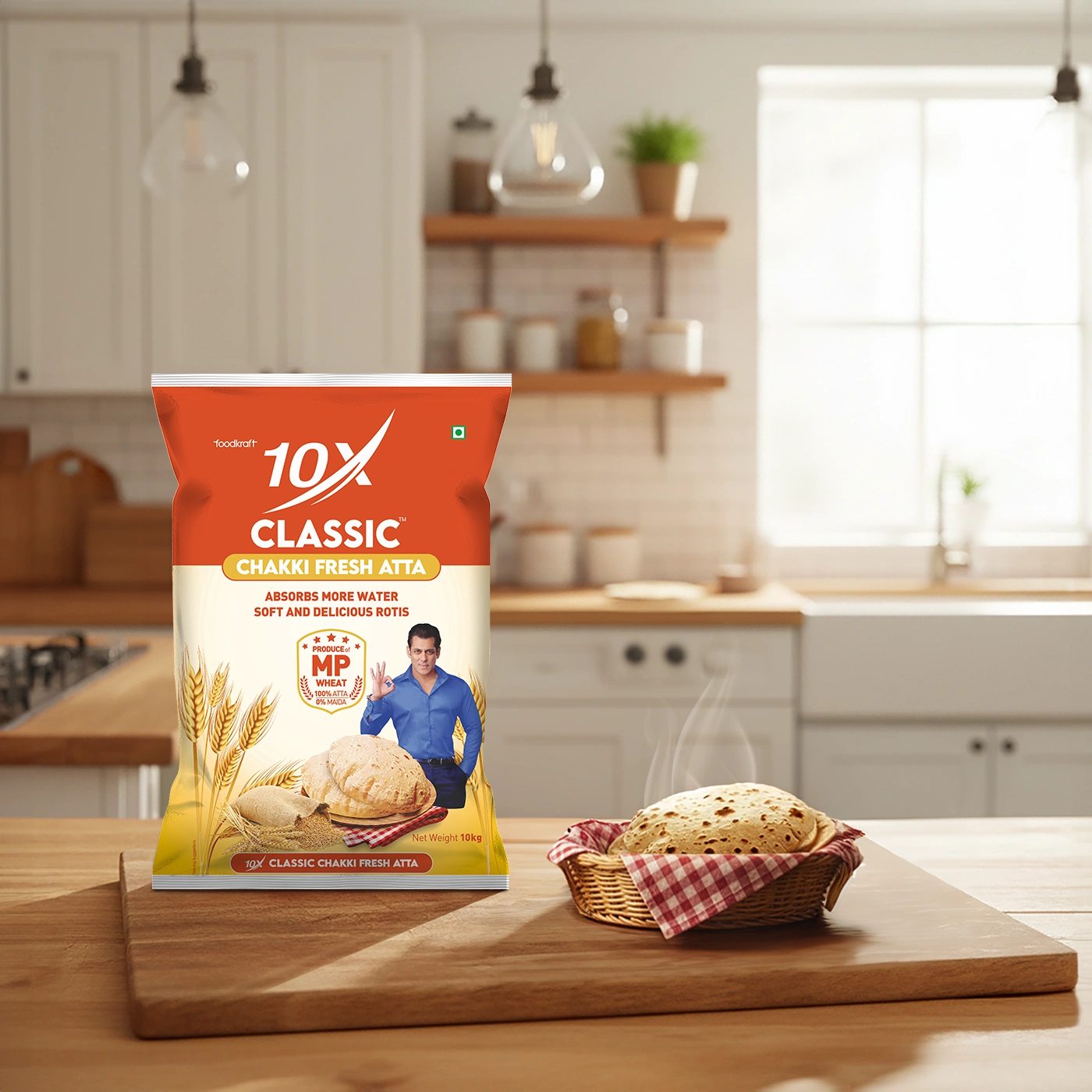 10X Classic Chakki Fresh Atta (10kg) is crafted from carefully selected high-quality MP wheat, known for its superior grain strength and taste. Using the traditional chakki grinding method, the wheat is slowly milled to retain natural fiber, nutrition, and authentic wheat flavour. This atta absorbs more water, resulting in softer dough and rotis that stay soft for longer. With 100% atta and 0% maida, it supports a balanced and healthy family diet. Packed hygienically in a large 10kg pack, it is ideal for joint families, high-consumption households, and bulk buyers looking for consistent quality and value.