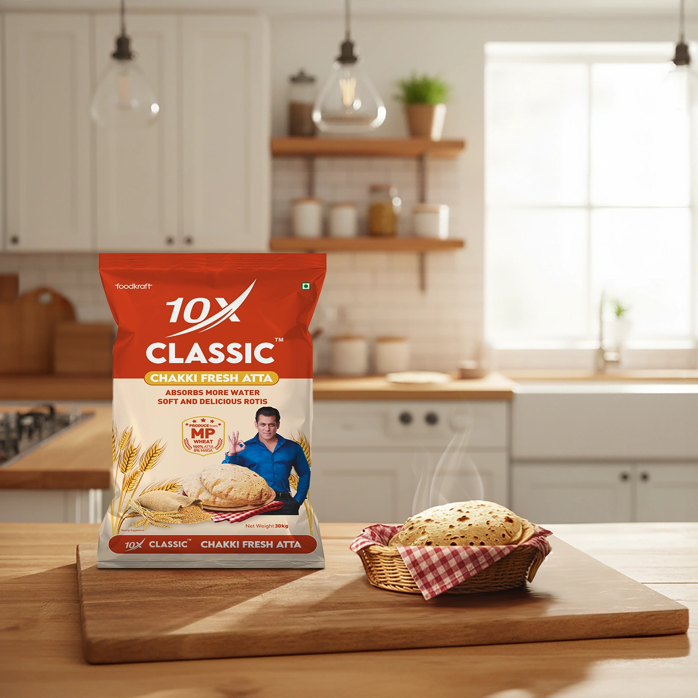 10X Classic Chakki Fresh Atta (30kg) is produced from carefully selected high-quality MP wheat, known for its strong grains and superior taste. The traditional chakki grinding method helps retain natural fiber, nutrition, and authentic wheat flavour, ensuring reliable performance even in bulk cooking. This whole wheat atta absorbs more water, resulting in softer dough and rotis that stay soft for longer hours-an essential requirement for restaurants, hotels, hostels, and community kitchens. With 100% atta and 0% maida, it supports balanced meals while delivering consistency, hygiene, and value in every batch. Packed in a heavy-duty 30kg bag, it is ideal for commercial and institutional use.
