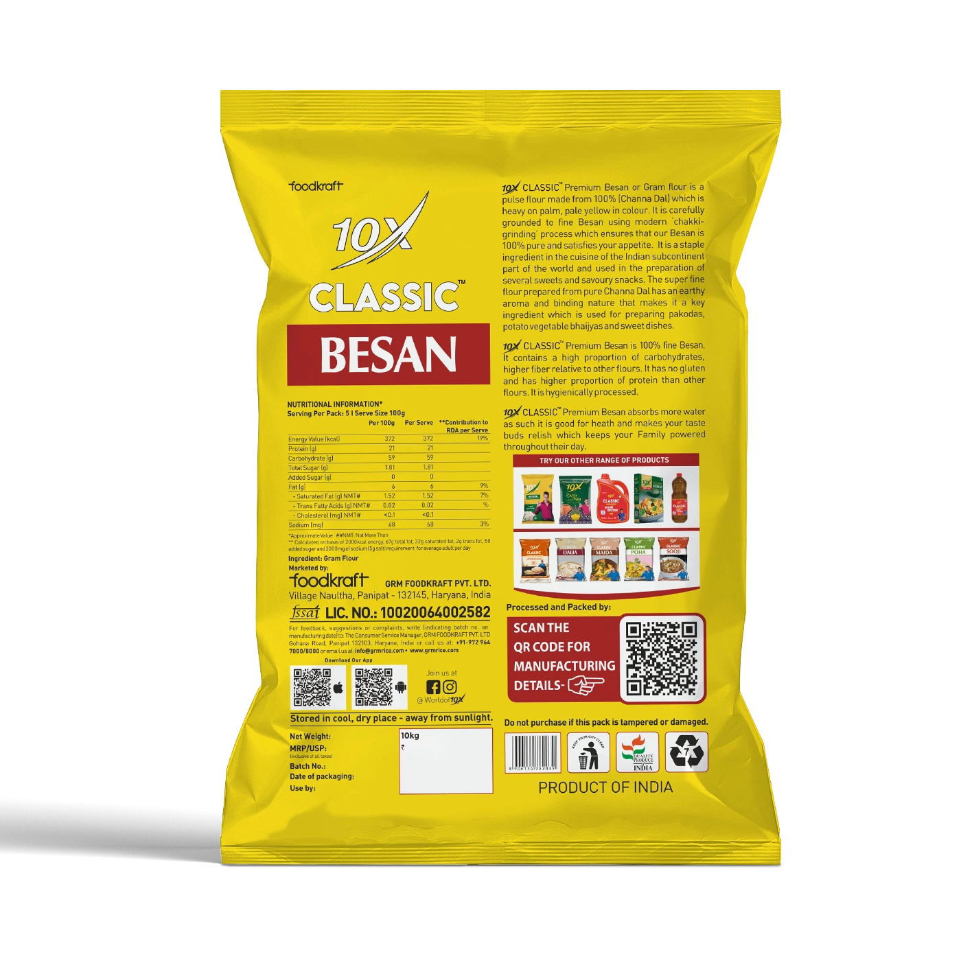 10X Classic Besan 10kg is carefully produced from selected chana dal and finely milled to deliver smooth, lump-free besan with authentic taste and aroma. Designed to perform consistently in large-batch cooking, this besan blends easily and enhances flavour across a wide range of Indian dishes. Naturally rich in protein and dietary fiber, besan is widely used in Indian kitchens for both nutrition and taste. From crispy pakoras and kadhi to dhokla, chilla, and traditional sweets, 10X Classic Besan delivers dependable results every time. Hygienically processed and packed in a sturdy 10kg bag, it is ideal for high-usage and commercial environments.