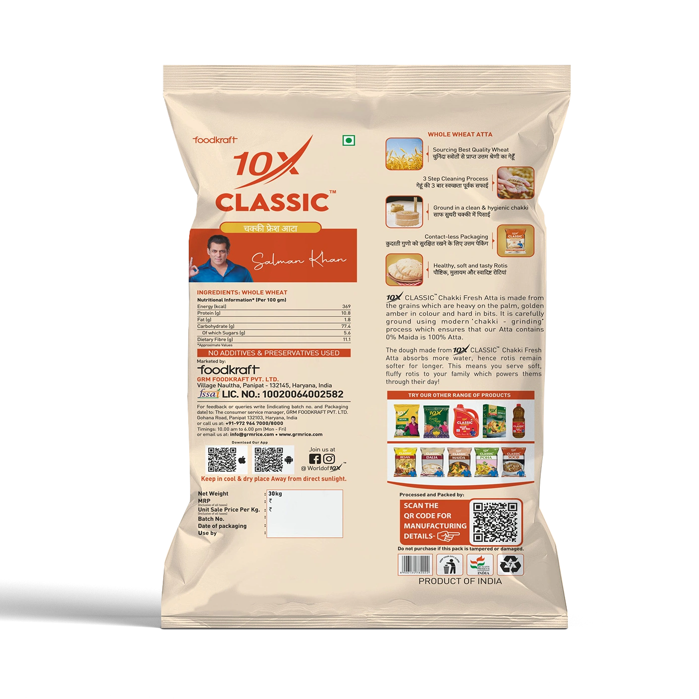 10X Classic Chakki Fresh Atta (30kg) is produced from carefully selected high-quality MP wheat, known for its strong grains and superior taste. The traditional chakki grinding method helps retain natural fiber, nutrition, and authentic wheat flavour, ensuring reliable performance even in bulk cooking. This whole wheat atta absorbs more water, resulting in softer dough and rotis that stay soft for longer hours-an essential requirement for restaurants, hotels, hostels, and community kitchens. With 100% atta and 0% maida, it supports balanced meals while delivering consistency, hygiene, and value in every batch. Packed in a heavy-duty 30kg bag, it is ideal for commercial and institutional use.